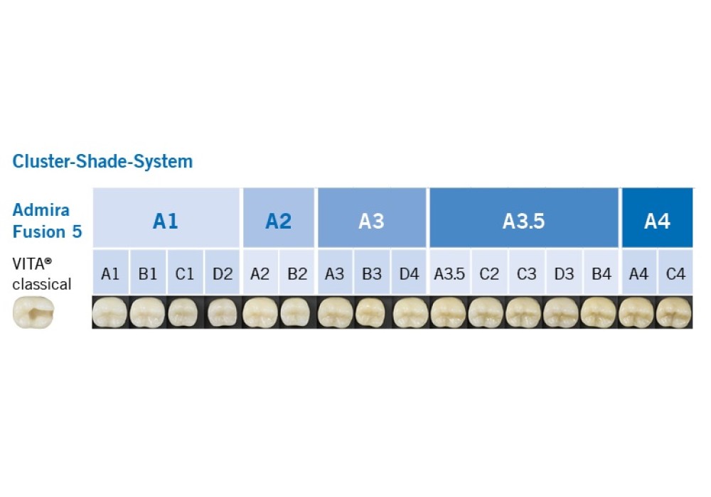 - Toutes les 16 nuances du teintier VITA classical peuvent être couvertes avec seulement 5 teintes cluster - une stratification de plusieurs teintes n'est pas nécessaire