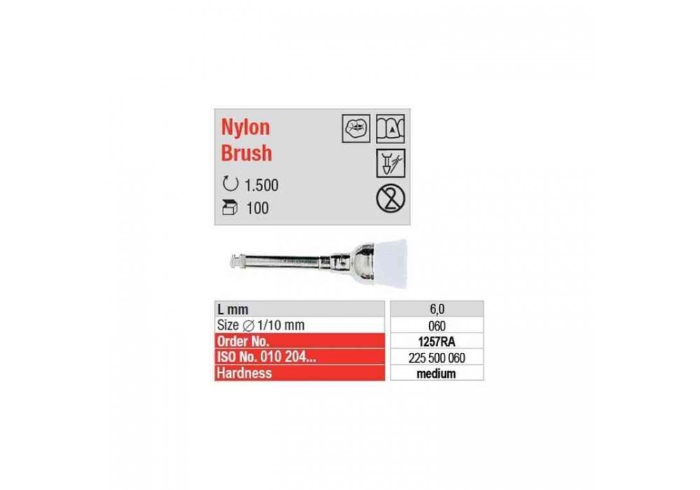 Brossettes en nylon avec tige pour contre-angle pour l'élimination de dépôts sur les dents, avec la pâte à polir, sur les surfaces occlasales, cuspides et flancs cuspidiens.