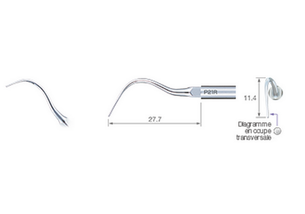 • Forme : Insert coudé vers la droite / curetage du cément radiculaire