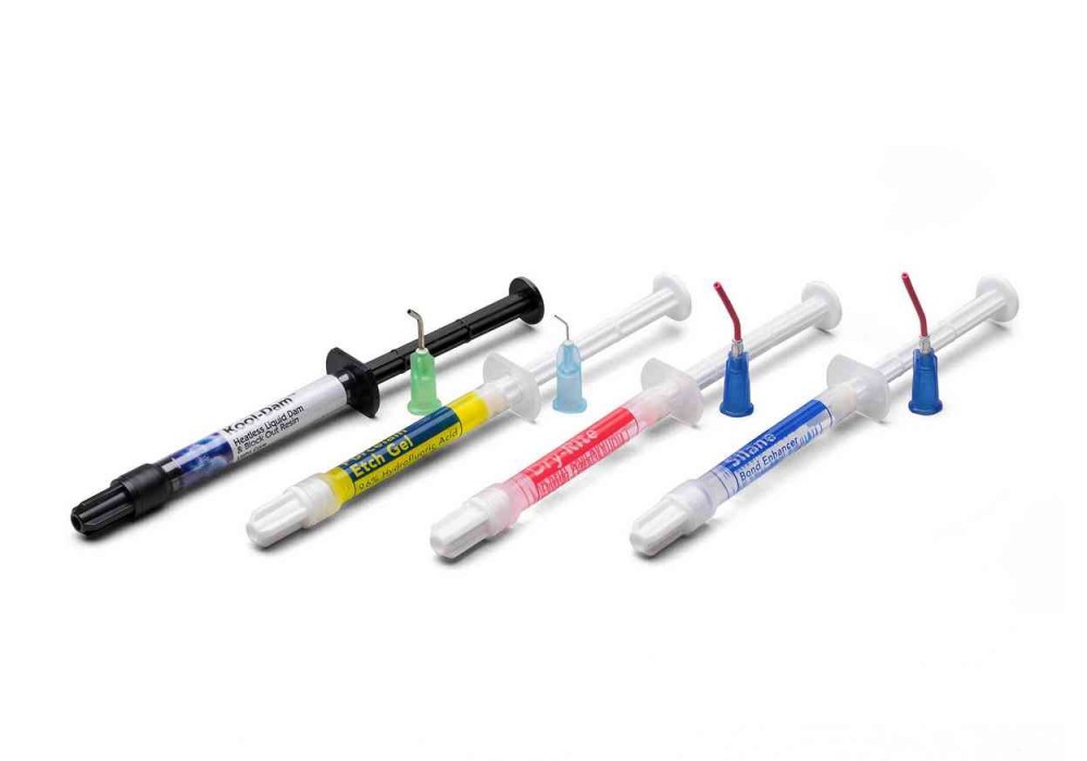 Conditonnement : Le kit contient 1 Seringue de 1,2 ml de Porcelain Etch Gel + 1 seringue de 1,2 ml de Silane + 2 seringues de 1,2 ml Dry Rite Agent séchant + 1 seringue de 1,2 ml de Kool Dam + 4 embouts + 4 aiguilles.